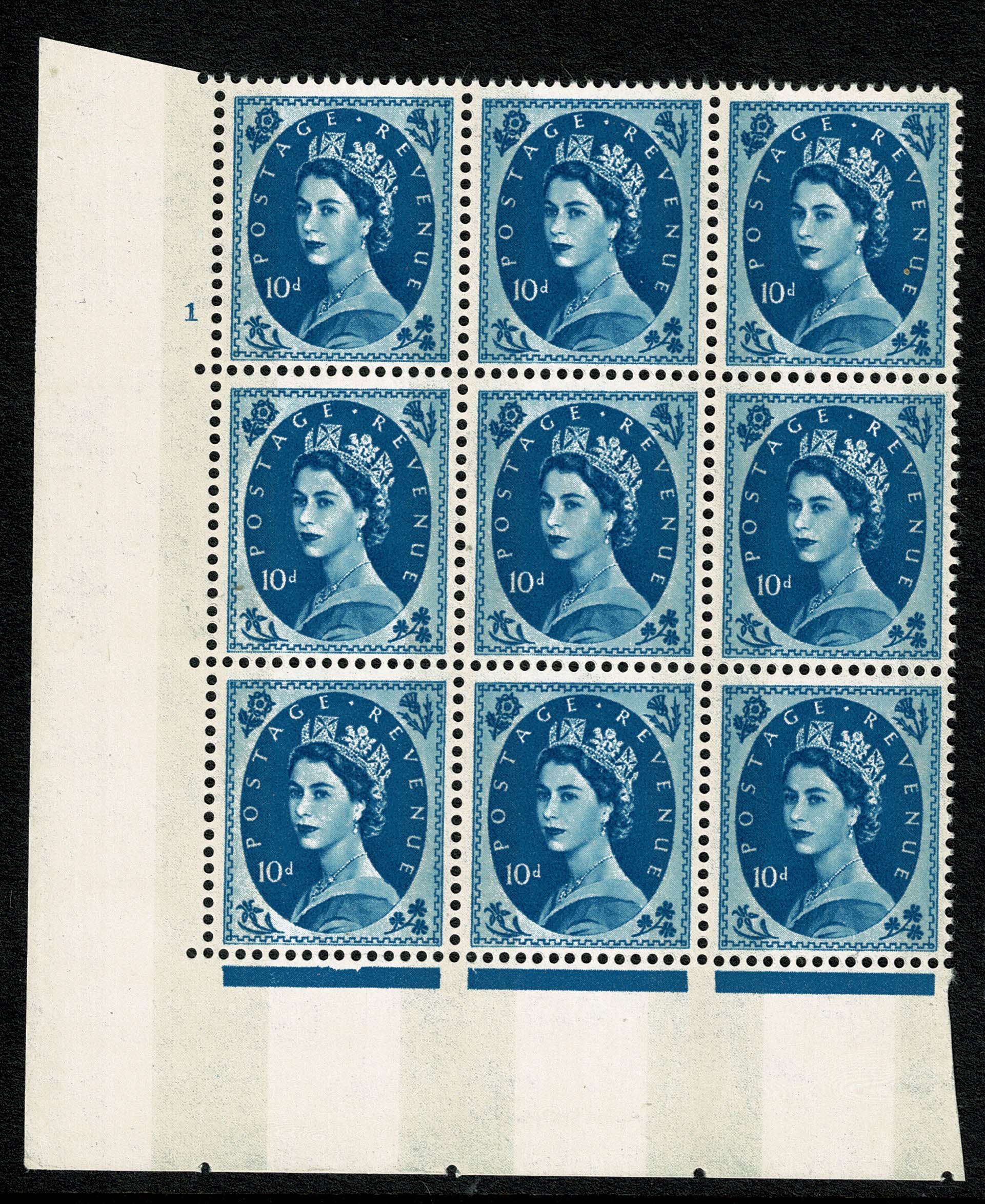 10d Prussian blue 2B Wmk Multiple Crowns . Cylinder 1 no dot block of nine Perf Type A (E/I) . SG 617d
