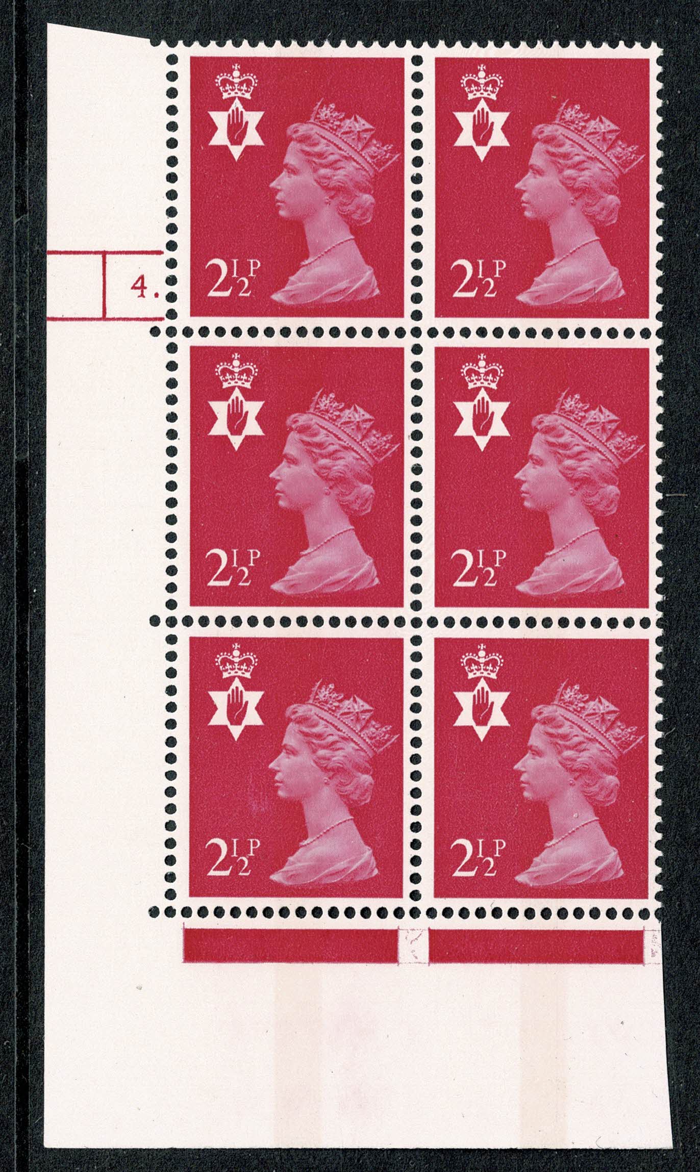 N. Ireland 2½p magenta FCP/PVA CB. Cyl. 4 dot p9 -21 block of six.